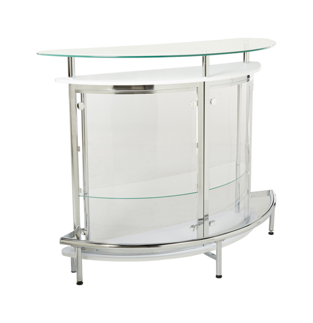 A minimalistic contemporary style bar and display piece in one. The sleek design features a durable metal frame a demilune shape tempered glass top and smoked acrylic front. Dimensions are 51″W x 20″D x 41″H Contemporary bar in white and chrome Tempered clear glass top and transparent acrylic outer shell Two large shelves and a stemware rack…