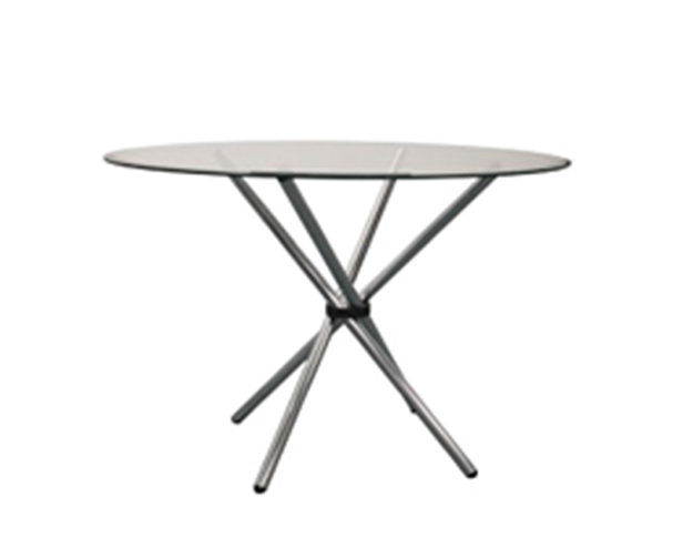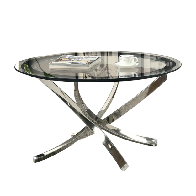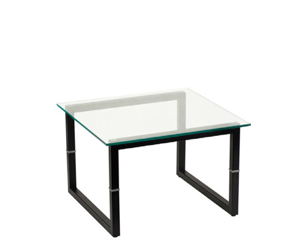 The piece carries a curvaceous base with a nickel finish and tempered glass table tops with a black frame around the edge. Dimensions are 35.5″ x 35.5″ x 19″H